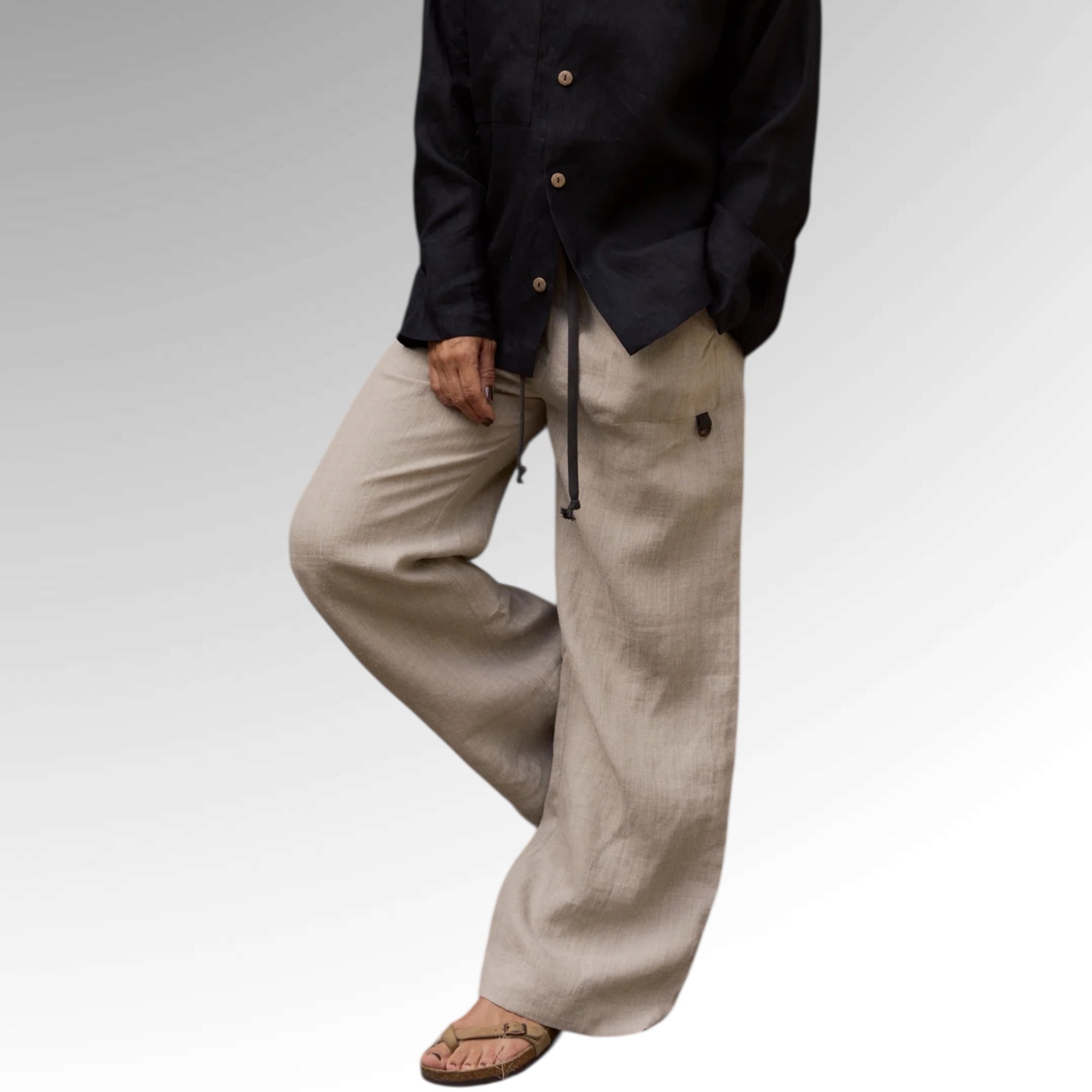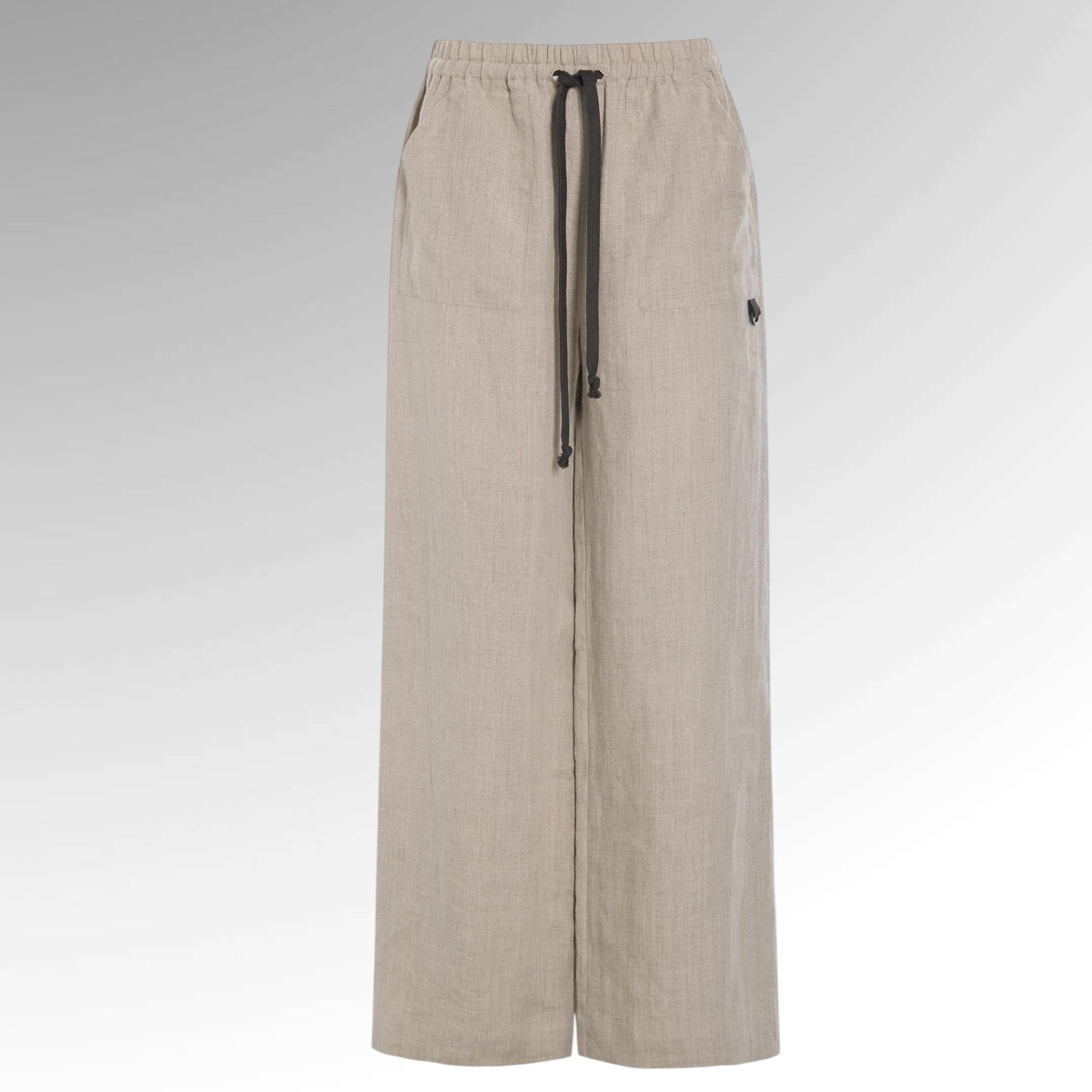 Hemp pants with a light and relaxed expression, shaped with flared legs in a full-length silhouette. Designed with practical side pockets and finished with ties at the front for an easy, adjustable fit.