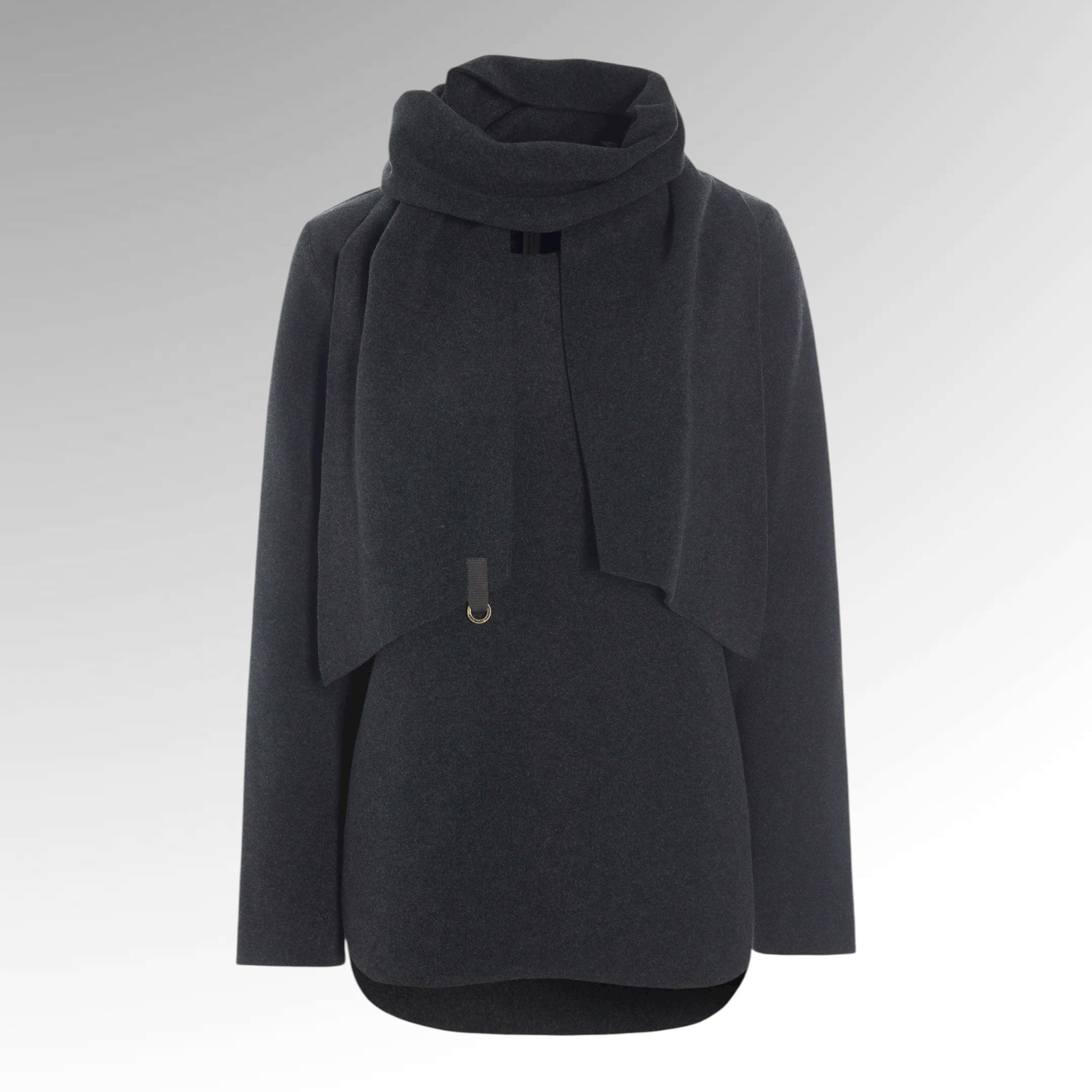 A fleece top featuring a round neckline, long sleeves, and a matching scarf, designed with a rounded hem and a slightly longer back to create a flattering silhouette.