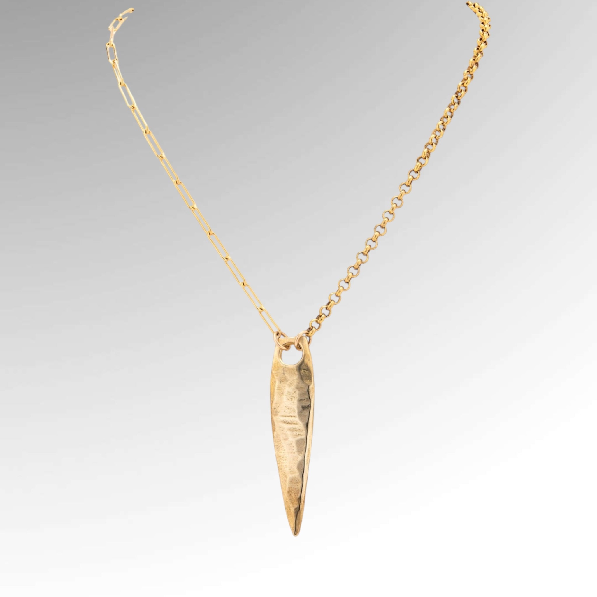 Mixed brass chain and 14K gold filled chain with oversized handcarved spear casted in brass. 18″ long.